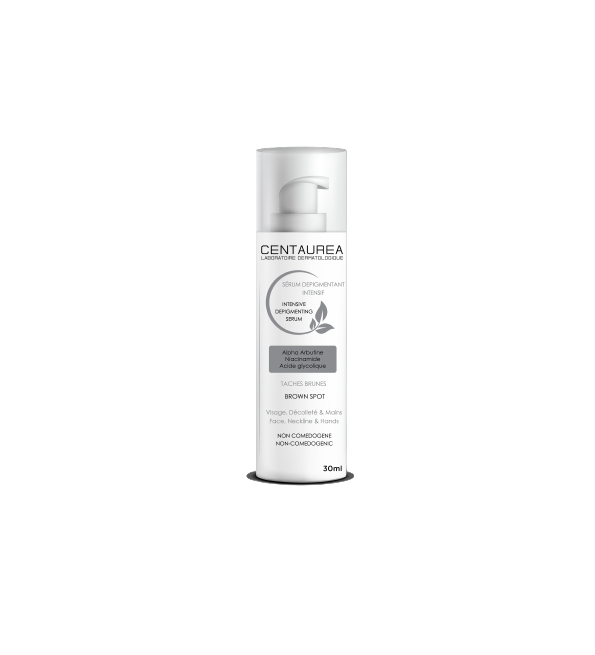 Le sérum dépigmentant intensif Centaurea est un soin apportant une solution pour la prise en charge des taches brunes et de l’hyperpigmentation cutanée, notamment dans les cas suivants : Mélasma (masque de grossesse), dyschromie (tâches de vieillesse), lentigo solaire, marques cicatricielles post-inflammatoires (acné,…..). Grâce à l’Alpha Arbutine, la Niacinamide et l’acide glycolique, le sérum dépigmentant Centaurea a une action complète sur : -la dépigmentation des taches brunes -le renouvellement cellulaire -la diminution de production de mélanine. La présence de la vitamine E allantoïne permet également de bien hydrater la peau pour compléter l’action dépigmentante. Convient à tous les types de peaux Peut s’utiliser toute l’année.